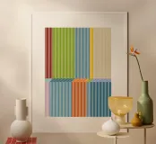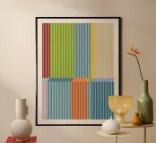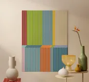 Ein kühnes geometrisches Muster mit feinen vertikalen Streifen in satten Rot-, Blau-, Grün-, Rosa-, Gelb-, Orange- und warmen Beigetönen. Das Muster erzeugt ein dynamisches Gefühl der Bewegung mit einem subtilen 3D-Effekt und verbindet spielerische Farbkontraste mit einem richtungsweisenden Rhythmus. Inspiriert von der Bauhaus-Ästhetik, bringt dieses auffällige Design lebendige Energie und einen klaren, modernen Stil in Wohndekorationen, Accessoires, Kleidung und vieles mehr.