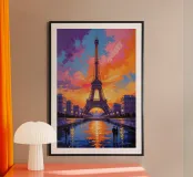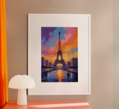 Dieses impressionistische Gemälde zeigt den Eiffelturm bei Sonnenuntergang, der sich glänzend im ruhigen Wasser der Seine spiegelt. Kräftige und lebhafte Striche in Orange, Rosa und Blau gehen harmonisch ineinander über und schaffen ein fesselndes Spiel aus Licht und Farbe. Das Gemälde zeigt Paare, die am Flussufer spazieren gehen, eingetaucht in die romantische Atmosphäre von Paris. Der ikonische Turm erhebt sich, in warme Farben getaucht, und seine verschlungene Struktur leuchtet vor dem dynamischen Himmel. Dieses Kunstwerk strahlt ein Gefühl von Wärme und Intimität aus und zelebriert die zeitlose Schönheit des Eiffelturms in seiner Pariser Umgebung.
