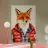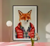 Ein realistisches Aquarellporträt eines majestätischen Rotfuchses, der eine rote Pufferweste und einen blau-grün karierten Flanell trägt.