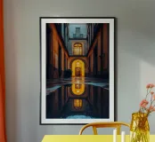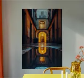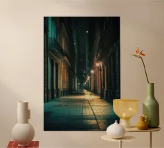 Diese Fotografie fängt den nächtlichen Zauber Barcelonas ein, wo die Reflexionen der goldenen Lichter eine stille Gasse nach dem Regen beleuchten. Die warme und friedliche Atmosphäre lädt dazu ein, dem Alltag zu entfliehen und in die Intimität dieser bezaubernden Stadt zu reisen.