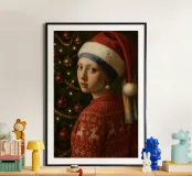 Lustiges klassisches Porträt eines Mädchens mit Perlenohrring, das einen Weihnachtspullover und eine Weihnachtsmannmütze trägt.