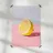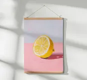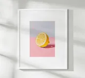 Einfaches Ölgemälde einer Zitrone vor pinkem Hintergrund, aus niedriger Perspektive. Minimalistische Pinselstriche, flache Formen, Pastellfarben und negative Räume schaffen eine luftige, helle Komposition mit Vintage-Ästhetik und verspieltem, kinderbuchähnlichem Stil.