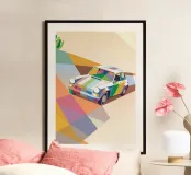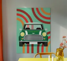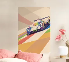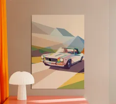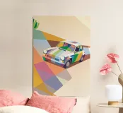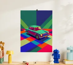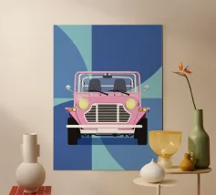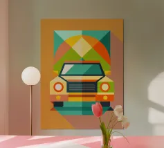 Holen Sie sich eine Illustration von einem bunten Oldtimer in der Wüste mit einem modernen geometrischen Stil.
