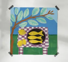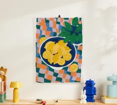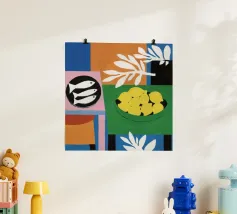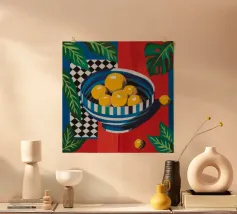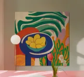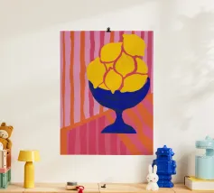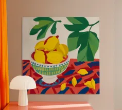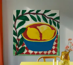 Ein sanftes und heiteres Stillleben einer Schale mit Zitronen auf einer gemusterten Oberfläche, mit fließenden grünen Blättern im Hintergrund, das in einer sanften, pastellartigen Palette wiedergegeben ist.