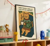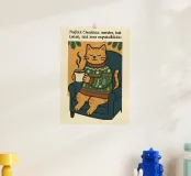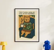 Fangen Sie die ultimative gemütliche Urlaubsstimmung mit diesem liebenswerten und sympathischen Poster ein. Es zeigt eine charmant illustrierte rotbraune Katze, die gemütlich in einem blauen Sessel sitzt und zufrieden an einer Tasse dampfenden heißen Kakao nippt. Die Katze trägt einen lustigen "hässlichen" Weihnachtspullover, der mit Bäumen und Schneeflocken verziert ist. Über der Illustration steht das Zitat: "Perfekte Weihnachten: Pullover, heißer Kakao und keine Verpflichtungen". Der Kunststil ist retro, verspielt und grafisch, mit einem subtilen strukturierten Finish. Der ideale Druck für Katzenliebhaber und alle, die sich nach maximaler Entspannung sehnen. Dieses hochwertige 7000×5000 p