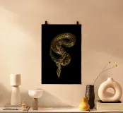 Erhöhen Sie Ihren Raum mit der faszinierenden Anziehungskraft unseres Python Posters, das die gewundene Schönheit einer Python vor einem kräftigen schwarzen Hintergrund zeigt. Der intensive Kontrast hebt die filigranen Schuppen und anmutigen Kurven dieser bemerkenswerten Kreatur hervor und verleiht jedem Raum einen Hauch von Geheimnis und Raffinesse. Dieses hochwertige Poster eignet sich perfekt für Naturliebhaber oder alle, die eine Vorliebe für kräftige Dekoration haben, denn es verspricht lebendige Details und dauerhafte Farben. Lassen Sie dieses fesselnde Werk zum Mittelpunkt Ihres Raumes werden. Entfesseln Sie die Kraft und Eleganz der Wildnis