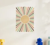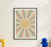 Strahlende Linien in erdigen Tönen wie Grün, Braun und Orange erstrecken sich von einem zentralen Kreis nach außen und erzeugen einen Sunburst-Effekt. Das Design weist eine Retro-Ästhetik mit symmetrischen Mustern und einer beruhigenden Farbpalette auf.