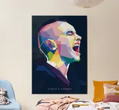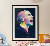 Ein lebhaftes und geometrisches Porträt von Sinead O'Connor im WPAP-Stil mit kühnen, kantigen Formen und einer auffälligen Reihe heller, kontrastreicher Farben. Das Kunstwerk fängt ihre ikonischen Merkmale, wie ihren rasierten Kopf, ihre stechenden Augen und ihren starken Gesichtsausdruck, mit scharfen, fragmentierten Farbblöcken ein. Die Komposition betont Tiefe und Emotionen und behält gleichzeitig die unverwechselbare kubistische Pop-Art-Ästhetik von WPAP bei, wodurch eine visuell dynamische und moderne Hommage an die legendäre Sängerin entsteht.