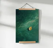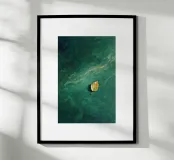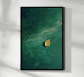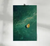 Ein einsames Herbstblatt treibt sanft über ein strukturiertes, tiefgrünes Gewässer. Diese minimalistische Komposition erweckt ein Gefühl der Ruhe, der stillen Introspektion und der stillen Schönheit der Natur in Bewegung. Es eignet sich perfekt für ruhige und meditative Räume und lädt den Betrachter zu Stille und poetischer Reflexion ein.