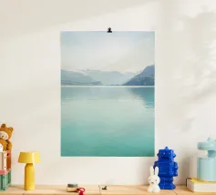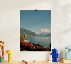 Ein frischer Frühlingstag an den Ufern des Thunersees mit den schneebedeckten Gipfeln der Berner Alpen. Diese friedliche Landschaft bietet ruhiges Wasser, ein charmantes Schweizer Dorf und majestätische Berge unter einem klaren blauen Himmel. Aufgenommen mit einer Fujifilm-Kamera in natürlichen Farbtönen - ideal für Kunstliebhaber, Reisende und Liebhaber der Alpenfotografie.