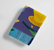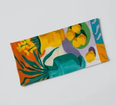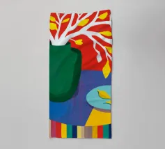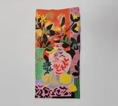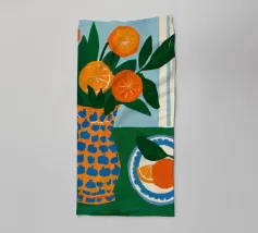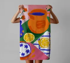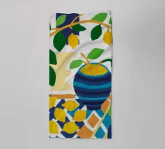 Ein Stillleben mit Zitronen in einer blauen Schale, die auf einem reichhaltigen violetten Tuch ruht. Dahinter steht eine hohe gelbe Vase mit weißen Zweigen vor einem feurig orangefarbenen Hintergrund, der eine kontrastreiche, farbenfrohe Szene erzeugt.