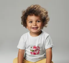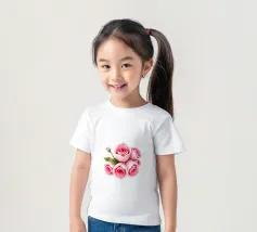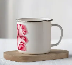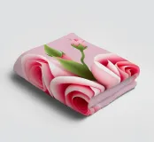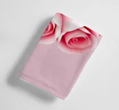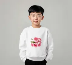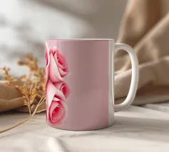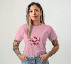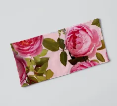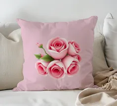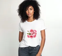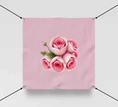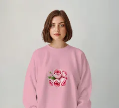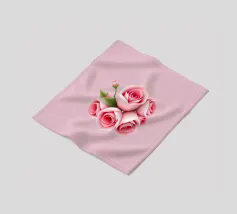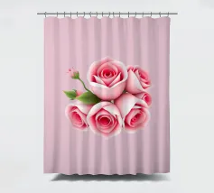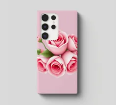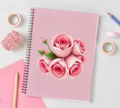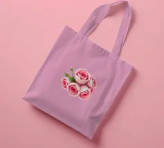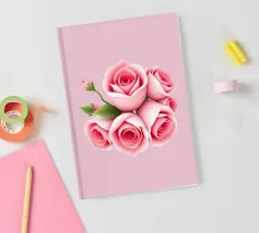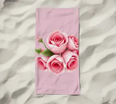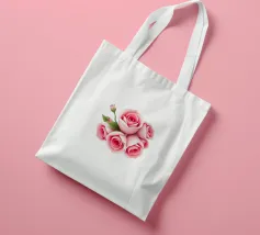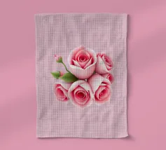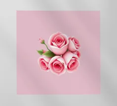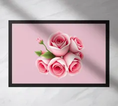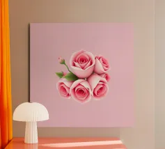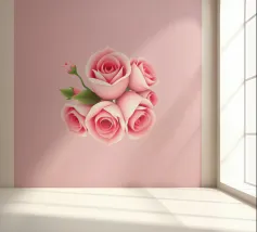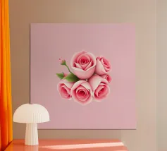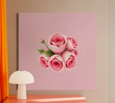 Dieses Kunstwerk zeigt ein atemberaubendes Arrangement aus rosafarbenen Rosen, deren zarte Blütenblätter und sattgrüne Blätter vor einem hellen, neutralen Hintergrund zu sehen sind.