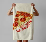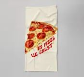 Lustiges Foodie-Design mit dem Satz "In Pizza We Crust" und einer leckeren Peperonischeibe.