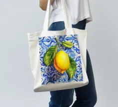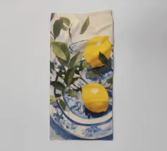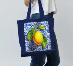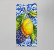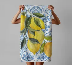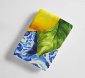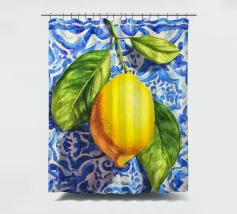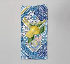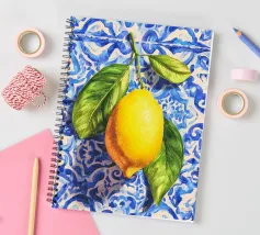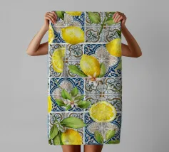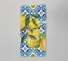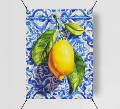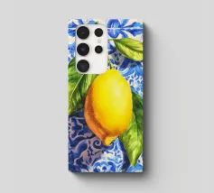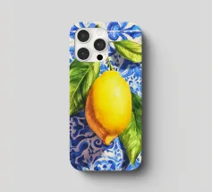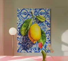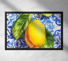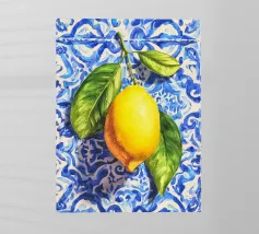 Erfrischendes Aquarellbild mit leuchtend gelben Zitronen vor einem stilisierten blauen und weißen mediterranen Fliesenhintergrund. Das Design kombiniert die sonnige Energie von Zitrusfrüchten mit traditionellen Fliesen und schafft so ein Werk, das sowohl klassisch als auch modern wirkt. Es eignet sich perfekt, um Wandkunst und Wohndekoration einen Hauch von Küstencharme zu verleihen und ist auch eine reizvolle Wahl für Accessoires und einzigartige Geschenke. Ideal für alle, die den mediterranen Stil, helle Farben und eine fröhliche Sommerästhetik lieben.