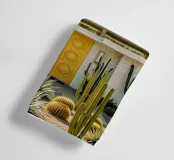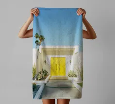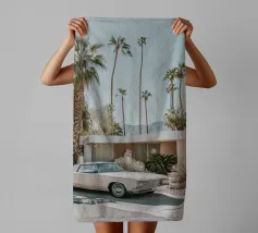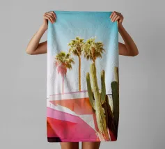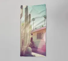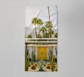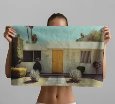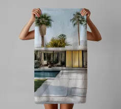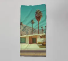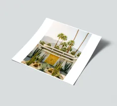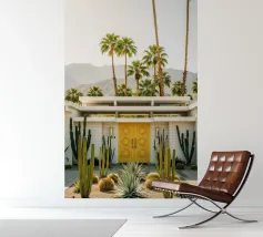 Holen Sie sich den Charme von Palm Springs in Ihr Zuhause mit diesem lebendigen Kunstdruck, der ein modernes Haus aus der Mitte des Jahrhunderts zeigt, eingerahmt von Kakteen, Palmen und den dahinter liegenden Bergen.