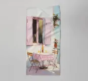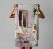 Das Motiv zeigt eine charmante mediterrane Balkonszene in sanften Pastelltönen. Ein kleiner Tisch mit rosa Tischdecke, zwei Stühlen und einer Flasche lädt zum Verweilen in der Sonne ein. Die sanften Pinselstriche und das warme Licht vermitteln ein Gefühl von Sommer, Leichtigkeit und Urlaub am Meer.