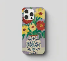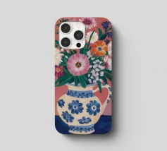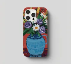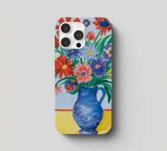 Ein lebhaftes Arrangement bunter Wildblumen in einer kräftigen blauen Vase. Der Hintergrund ist ein strukturiertes, gemustertes Rosa, das eine reiche und fröhliche Komposition voller Leben und Farbe schafft.
