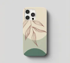 Ein Blattzweig überschneidet sich mit geometrischen Formen, darunter geschwungene Linien und geschichtete, gedämpfte Töne. Die Kombination schafft eine harmonische Mischung aus Natur und abstraktem Design.
