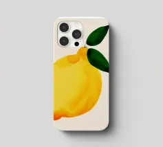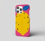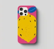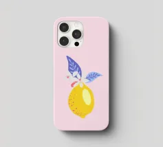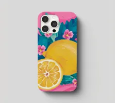 Eine große, einzelne gelbe Zitrone, illustriert mit einem strukturierten, düsteren Stil vor einem leuchtend rosa Hintergrund. Das Werk ist eine kühne, moderne und grafische Pop-Art-Interpretation einer klassischen Frucht.