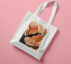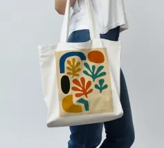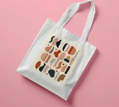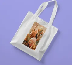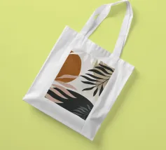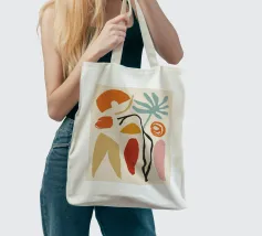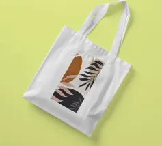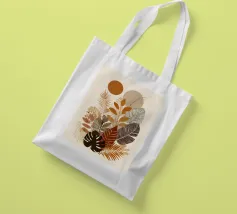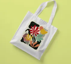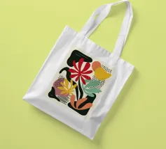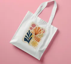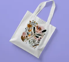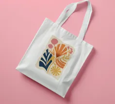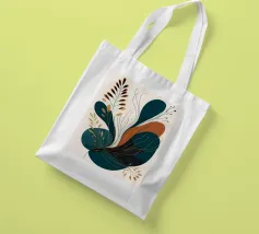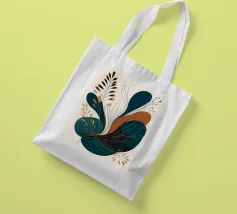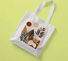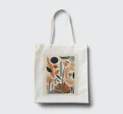 Eine moderne abstrakte Komposition aus verschiedenen stilisierten botanischen Formen und Blättern in einer Palette von Terrakotta, Beige und Dunkelblau vor einem hellen Hintergrund.
