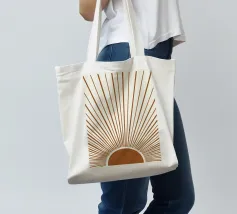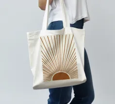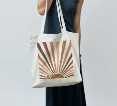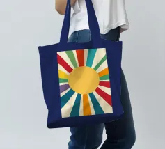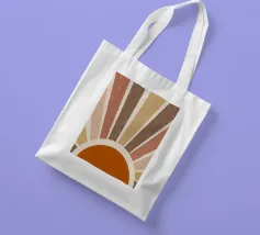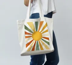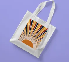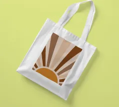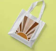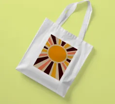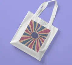 Strahlende Linien in erdigen Tönen wie Grün, Braun und Orange erstrecken sich von einem zentralen Kreis nach außen und erzeugen einen Sunburst-Effekt. Das Design weist eine Retro-Ästhetik mit symmetrischen Mustern und einer beruhigenden Farbpalette auf.