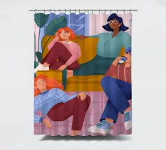 Freunde lümmeln auf einer Couch in einem mit bunten Dekorationen und Pflanzen geschmückten Wohnzimmer. Die entspannte und lockere Atmosphäre fängt die Freude ein, Zeit miteinander zu verbringen.