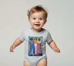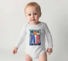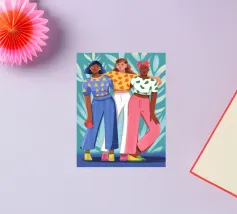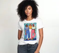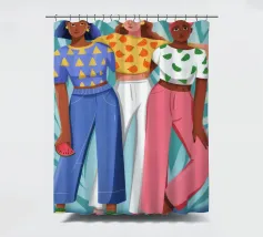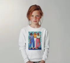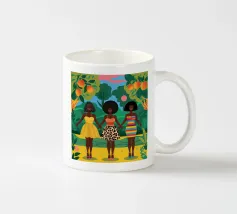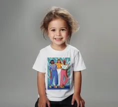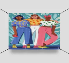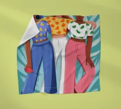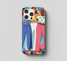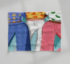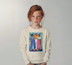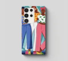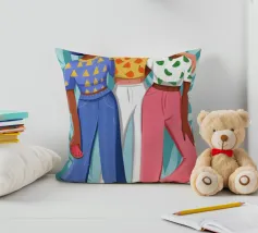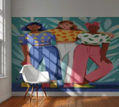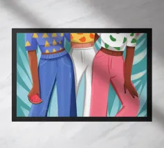 Dieses Gemälde zeigt drei Personen, die mit dem Rücken zum Betrachter zusammenstehen. Sie tragen bunte und gemusterte Kleidung, die ein starkes Band der Freundschaft und Einheit symbolisiert.