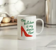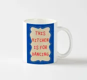 Ein fröhliches Schild verkündet in fetten roten Buchstaben auf beigem Grund "Diese Küche ist zum Tanzen da". Das verspielte Design suggeriert eine lebendige und einladende Atmosphäre, die perfekt für fröhliche Aktivitäten ist.