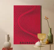 Ein auffälliges abstraktes Poster, das mit einem Punktverlauf eine dynamische optische Täuschung erzeugt. Das Design zeigt ein Feld aus kleinen Kohlepunkten, die in Dichte und Größe variieren und große, geschwungene Wellen oder Tunnel vor einem leuchtenden rosa/roten Hintergrund bilden. Diese Technik erzeugt ein starkes Gefühl von Tiefe und Bewegung, das für die Op Art charakteristisch ist, während die geometrische Präzision, die im Bauhaus verwurzelt ist, erhalten bleibt. Das Wort "BAUHAUS" ist unten in fetten, rosafarbenen serifenlosen Buchstaben zentriert. Dieser hochauflösende digitale Download (7000x5000 Pixel, 300 dpi) garantiert einen gestochen scharfen, visuell starken Druck.