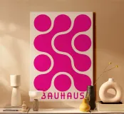 Ein auffallendes und modernes abstraktes Poster mit einem kontinuierlichen, organisch-geometrischen Muster, das als "Metaball" oder "Blob"-Kunst bekannt ist und in einem einzigen, intensiv leuchtenden Pink (Magenta) gehalten ist. Die geschwungenen, ineinander greifenden Formen erzeugen einen dynamischen visuellen Fluss und stehen in starkem Kontrast zu dem weichen, neutralen Hintergrund. Diese zeitgenössische Interpretation bringt die geometrische Einfachheit des Bauhauses in eine fließende, trendige Ästhetik. Der Schriftzug "BAUHAUS" ist am unteren Rand sauber zentriert. Diese hochwertige digitale Kunstdatei (7000x5000 Pixel, 300 dpi) garantiert einen scharfen, satten und einzigartig stilvollen Druck.