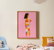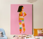 Setzen Sie mit diesem lebhaften, hoch stilisierten figurativen Gemälde ein mutiges Statement. Das Kunstwerk zeigt eine Frau in selbstbewusster Pose, die einen auffälligen Farbblock-Jumpsuit in leuchtenden Quadraten aus Orange, Gelb, Pink und Türkis trägt. Vor einem strukturierten Hintergrund in Pink verkörpert die grafische Figur die kühne Ästhetik des Maximalismus und die spielerische Energie von Dopamine Decor. Die sichtbaren Pinselstriche verleihen dem Werk Tiefe und Ausdruckskraft, während die Farbpalette und das Motiv moderne Mode und Pop-Art-Trends aufgreifen. Dieses hochwertige digitale Poster (7000x5000 Pixel, 300 dpi) ist ein