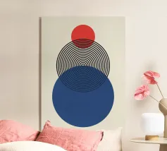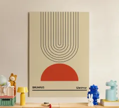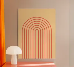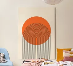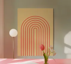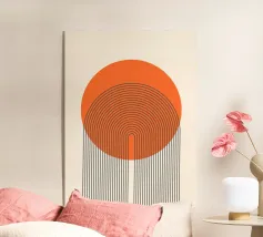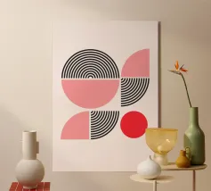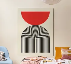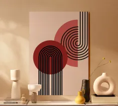 Mit diesem auffälligen abstrakten Kunstdruck verschmelzen Retro- und Modernismus-Ästhetik. Das Design zeigt einen kühnen roten Halbkreis, der einer komplexen Anordnung von schwarzen konzentrischen Bögen und parallelen Linien gegenübergestellt wird, wodurch eine visuell überzeugende und dynamische Komposition entsteht, die an das Grafikdesign der 70er Jahre erinnert. Dieses Stück verkörpert sowohl einen verspielten Retro-Charme als auch ein klares, modernes Gefühl. Mit einer beeindruckenden Auflösung von 7000x5000 Pixeln und einer Auflösung von 300 dpi stellt dieses hochwertige Digitalkunstwerk sicher, dass jede scharfe Linie und jeder leuchtende Farbton mit außergewöhnlicher Präzision wiedergegeben wird, was es zu einer überzeugenden Ergänzung für