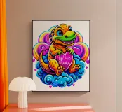 Dieser süße kleine Dinosaurier verbreitet Liebe, denn er umklammert freudig ein leuchtend rosa Herz, während er auf einem Bett aus bunten Wolken schwebt. Mit seinen großen, leuchtenden Augen und seinem verspielten Ausdruck bringt dieser Dino einen unwiderstehlichen Charme in jede Umgebung. Die leuchtenden Farben Orange, Grün und Rosa machen ihn zu einem optischen Leckerbissen für Dino-Liebhaber jeden Alters. Ob als niedliche Ergänzung zu Ihrer Einrichtung oder als lustiges Geschenk, dieser liebenswerte Dinosaurier ist bereit, Lächeln und Wärme zu verbreiten!