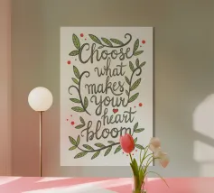 Wunderschön handgezeichnete Blumen. Mittig platziert ein toller Spruch. Moderne Brush Kalligrafie. Lebensmotto. Sinnspruch mit Leidenschaft, Herzlichkeit und positiver Lebenseinstellung. Folge dem Ruf deines Herzens.