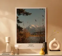 Ein frischer Frühlingstag an den Ufern des Thunersees mit den schneebedeckten Gipfeln der Berner Alpen. Diese friedliche Landschaft bietet ruhiges Wasser, ein charmantes Schweizer Dorf und majestätische Berge unter einem klaren blauen Himmel. Aufgenommen mit einer Fujifilm-Kamera in natürlichen Farbtönen - ideal für Kunstliebhaber, Reisende und Liebhaber der Alpenfotografie.