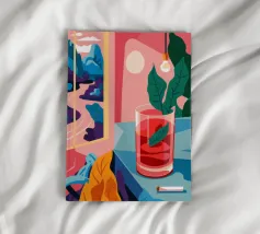 Ein stark stilisiertes und abstraktes Stilleben, das ein Getränk in einem mit Korb umwickelten Glas mit blauem Strohhalm zeigt. Die Szene befindet sich auf einer Fläche mit kräftigen roten und gelben Mustern vor einem strukturierten grünen Hintergrund.