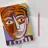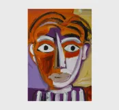 Dieses Gemälde zeigt ein stilisiertes Gesicht mit kräftigen Farben und geometrischen Formen. Das Gesicht hat große, ausdrucksstarke Augen, eine markante Nase und ein gestreiftes Hemd. Der Hintergrund ist eine Mischung aus orangefarbenen und gelben Tönen.