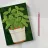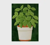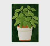 Das Bild zeigt eine üppige grüne Basilikumpflanze mit breit geäderten Blättern in einem weißen Topf mit rotbraunem Sockel. Der Hintergrund ist dunkelgrün und texturiert, was dem Motiv Tiefe verleiht. Der Stil kombiniert realistische botanische Details mit einem malerischen, leicht abstrahierten Look. Die Illustration wirkt lebendig und zugleich beruhigend – ideal für dekorative Zwecke oder als Teil einer naturinspirierten Serie. Die Farbwahl und Textur erzeugen eine warme, organische Atmosphäre.