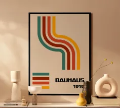Ein sehr energiegeladenes und kompliziertes Bauhaus-Ausstellungsplakat von Juli bis September 1919. Der Entwurf zeigt ein dichtes, faszinierendes geometrisches Muster, das vollständig aus mosaikartigen Dreiecken und ineinandergreifenden Formen besteht. Die lebhafte, warme Farbpalette - ein kräftiges Terrakotta-Rot, ein verbranntes Orange, ein helles Ocker-Gelb und ein kontrastreiches, tiefes Waldgrün - erzeugt einen auffälligen visuellen Rhythmus. Dieses komplexe Design ist eine Meisterklasse in modernistischer Farbtheorie und Abstraktion und eignet sich perfekt für ein kühnes Interieur. Der Text "BAUHAUS AUSSTELLUNG" und "JULI-SEPT 1919" rahmen die Grafik ein. Dieser hochauflösende Digitaldruck (7000x5000 Pixel