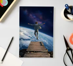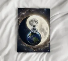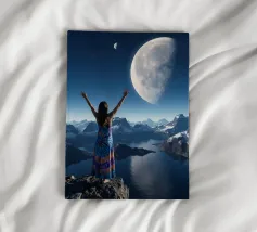 Dieses eindrucksvolle, surreale Porträt verbindet menschliche Schönheit mit kosmischen Wundern. Eine Frau steht vor einem sternenübersäten Universum, umrahmt von einem leuchtenden goldenen Heiligenschein, der mit Planeten, Monden und fernen Galaxien verziert ist. Ihre leuchtend blauen Augen und ihr Vintage-Spitzenkleid verleihen ihr Eleganz, während die himmlischen Elemente ein Gefühl von Geheimnis, Erleuchtung und Fantasie vermitteln. Perfekt für Liebhaber von Fantasy-Kunst, Astrologie, Weltraumthemen und symbolischen Darstellungen, die innere Welten und die Weite des Kosmos erkunden.