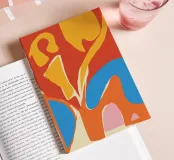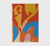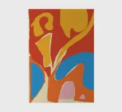 Helle, abstrakte Formen in warmen Rot-, Orange- und Gelbtönen sind mit kühlen blauen und zartrosa Abschnitten verwoben. Die Komposition zeichnet sich durch kühne und fließende Linien aus, die einen energiegeladenen und dynamischen visuellen Effekt erzeugen.