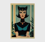 Dieses elegante Design zeigt eine stilisierte Frau mit Katzenmaske, goldener Kette und ausdrucksstarkem Blick. „Feline Queen“ verbindet Vintage-Glamour mit moderner Stärke – ein Sinnbild für Weiblichkeit, Selbstbewusstsein und Anziehungskraft. Mit seinen satten Farben und klaren Linien ist das Motiv ein echtes Design-Statement – sinnlich, mystisch und ikonisch zugleich.