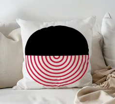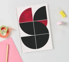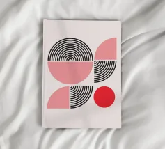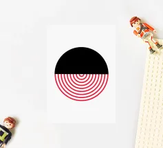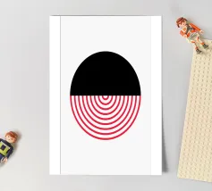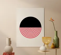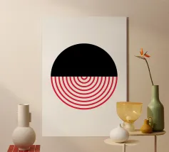 Entdecken Sie diesen auffälligen modernen Kunstdruck mit einem kühnen Kreis, der in zwei kontrastierende Hälften geteilt ist. Der schwarze, einfarbige obere Teil trifft auf eine dynamische untere Hälfte, die aus leuchtend roten, konzentrischen Halbkreisen vor einem klaren weißen Hintergrund besteht. Dieses minimalistische Design erzeugt eine starke visuelle Spannung und ein Gefühl der Bewegung, perfekt für zeitgenössische Innenräume. Verleihen Sie Ihrem Raum einen Hauch von abstrakter Raffinesse und grafischer Wirkung. Unser hochwertiges digitales Kunstwerk (7000x5000 Pixel, 300 dpi) sorgt für scharfe Linien und intensive Farben für ein atemberaubendes Wandbild.