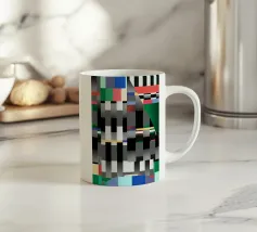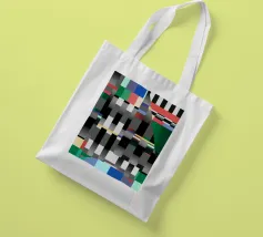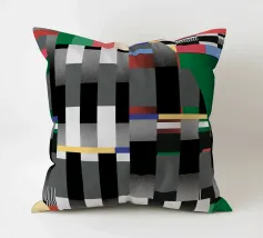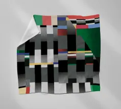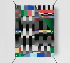 Kräftige geometrische Formen dominieren die Komposition mit einem Mix aus Farben und Mustern wie Streifen und Karomustern. Die Anordnung schafft ein lebendiges und dynamisches visuelles Erlebnis.
