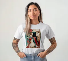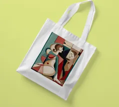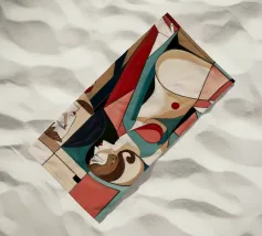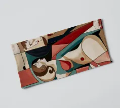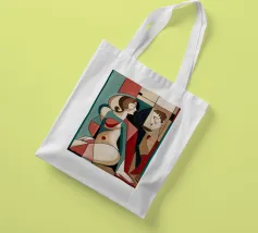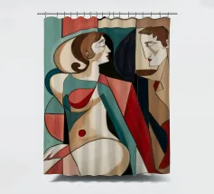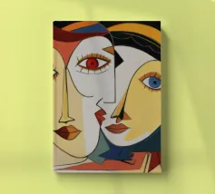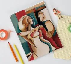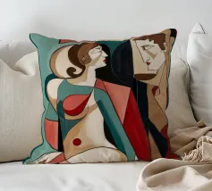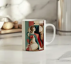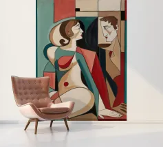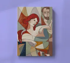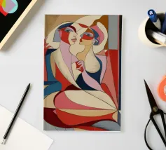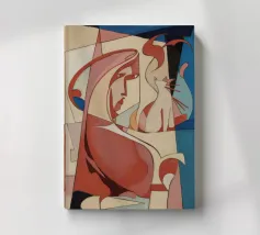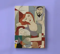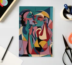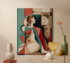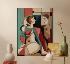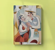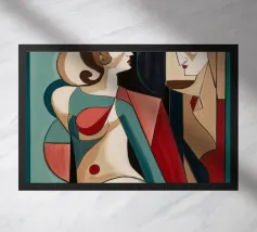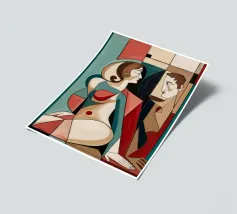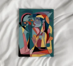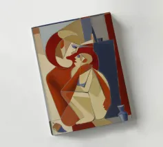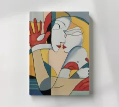 Dieses Gemälde zeigt zwei abstrakte Figuren in einer engen, intimen Pose. Die Verwendung von geometrischen Formen und kräftigen Farben verleiht der Szene Tiefe und Komplexität.
