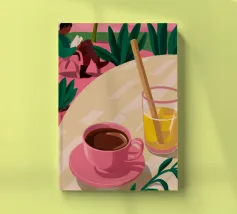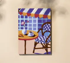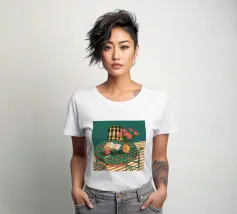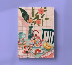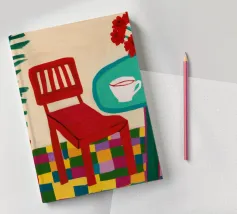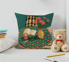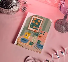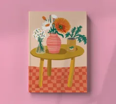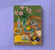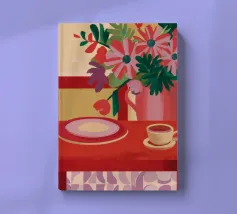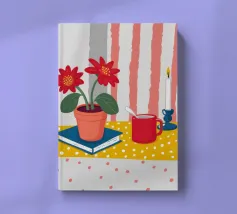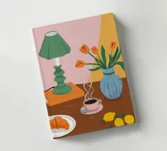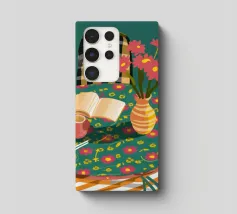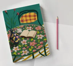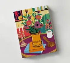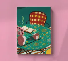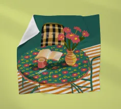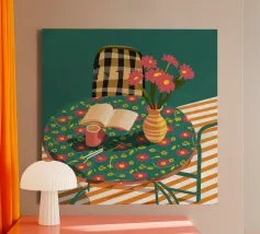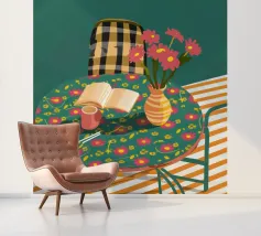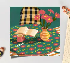 Eine gemütliche Innenraumszene mit einer Person, die an einem Tisch mit einer Blumenvase ein Buch liest, auf einem grün karierten Stuhl sitzend, was eine friedliche, heimelige Atmosphäre schafft.