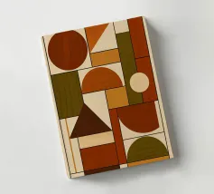 Ein abstraktes Kunstwerk mit geometrischen Formen in erdigen Orange-, Grün- und Beigetönen, gerahmt mit einem weichen Rand auf dunklem Hintergrund.