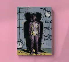 Verschiedene Symbole und abstrakte Formen schweben um eine zentrale stilisierte Figur. Das Vorhandensein von gezackten Linien und unregelmäßigen Farben verstärkt das Geheimnis der Szene.