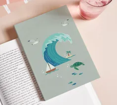 Eine niedliche Schildkröte, die auf einer Welle reitet, mit einfachen Wellenlinien und einem klaren Himmel.