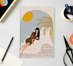 Eine charmante und gemütliche Illustration einer schwarz-weißen "Smoking"-Katze, die friedlich auf einem gelben Sofa schläft, umgeben von Topfpflanzen. Das Kunstwerk fängt die einfache, ruhige Freude eines Katzenschlafs ein.